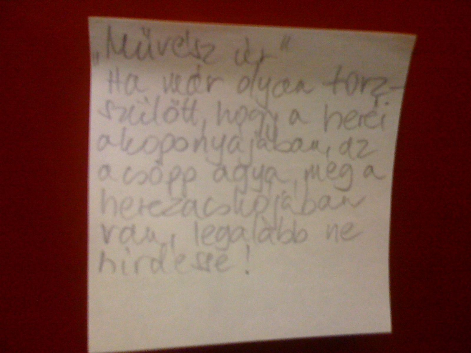 Ezzel a kis kedvességgel a liftünkben szembesültem, amit annak a kedves művésznek üzen egy lakónk, aki számtalan férfi nemi szervvel látta el a lift belsejét. Részemről a földszinttől a 8-ig hangosan kacagtam, eme kedves üzikén: